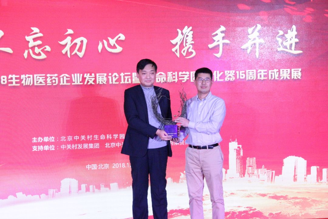 在本次論壇上,北京卓誠惠生生物科技股份有限公司副總經(jīng)理王雷代表公司向中關(guān)村生命園孵化器贈送15周年紀念品——鳳巢雕塑,祝愿孵化器將來有更多“金鳳凰”從這里騰飛。
