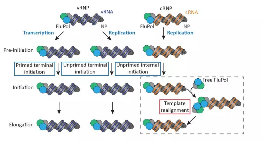 該研究揭示這兩種聚合酶有著高度類似的三維結(jié)構(gòu),它們會(huì)形成相似的二聚體(圖1)。針對(duì)二聚體結(jié)合面的關(guān)鍵氨基酸殘基的突變會(huì)抑制病毒基因的復(fù)制,并且是特異性地抑制vRNA的合成。這些結(jié)果表明流感病毒RNA聚合酶的二聚體結(jié)構(gòu)是病毒基因復(fù)制所不可缺少的。Ervin Fodor課題組此前曾經(jīng)報(bào)導(dǎo)流感病毒的基因復(fù)制需要通過一個(gè)游離的聚合酶來激活【11】。作者推測(cè)游離的聚合酶就是通過與包裝在RNP里的聚合酶形成這種二聚體,從而激活病毒基因的復(fù)制起始。