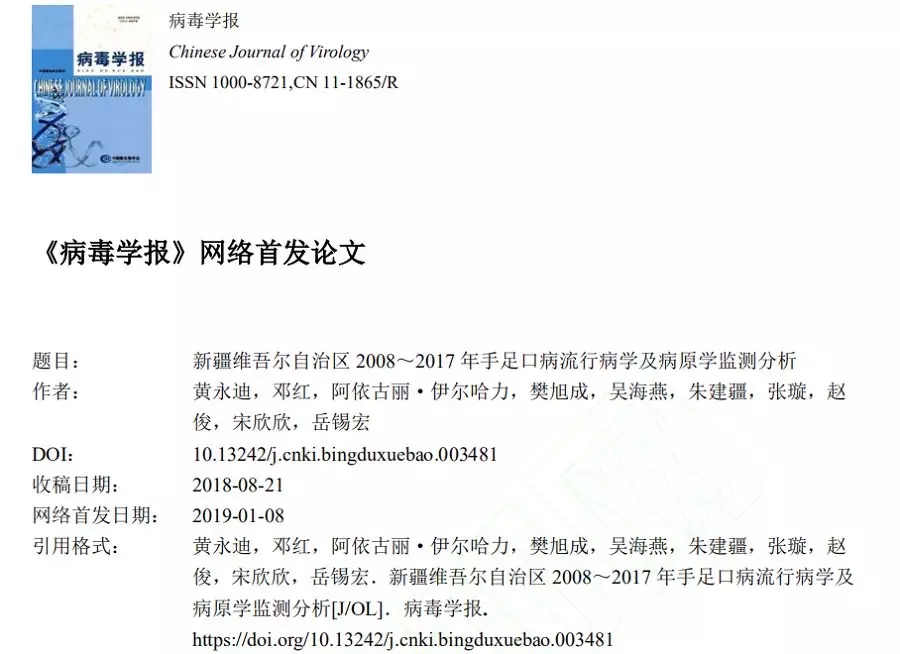 ◆《病毒學(xué)報(bào)》2018年第35卷第1期論文(論著),《病毒學(xué)報(bào)》CNKI網(wǎng)絡(luò)單篇首發(fā)論文:新疆維吾爾自治區(qū)2008年~2017年手足口病流行病學(xué)及病原學(xué)監(jiān)測分析