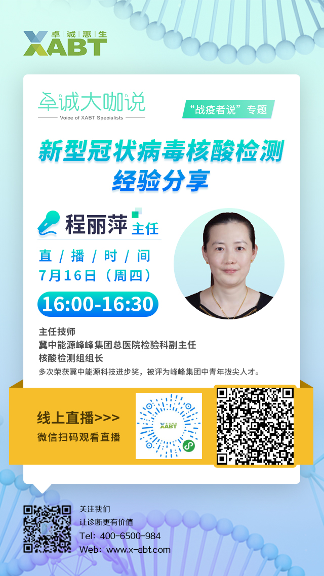 卓誠大咖說之“戰(zhàn)疫者說”專題第三期將于7月16日16:00正式開播,我們非常榮幸邀請到冀中能源峰峰集團(tuán)總醫(yī)院檢驗科程麗萍主任為我們帶來《新型冠狀病毒核酸檢測的經(jīng)驗分享》的主題講座,期待各位屆時蒞臨直播間,共同學(xué)習(xí),互相啟發(fā)!