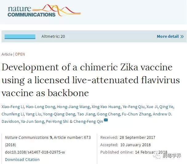 1? Li XF, Dong HL, Wang HJ, Huang XY, Qiu YF, Ji X1,Ye Q, Li C, Liu Y, Deng YQ, Jiang T, Cheng G, Zhang FC, Davidson AD, Song YJ1,Shi PY, Qin CF. Development of a chimericZika vaccine using a licensed live-attenuated flavivirus vaccine as backbone.Nat Commun. 2018 Feb 14;9(1):673.