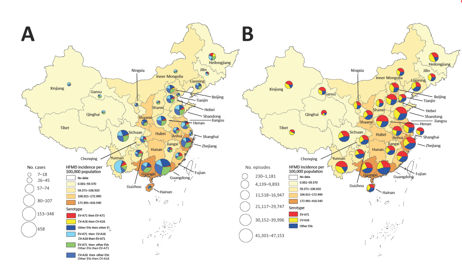 圖2. 復(fù)發(fā)性手足口?。ˋ)病例和腸道病毒感染(B)的地理分布圖(點擊可放大)