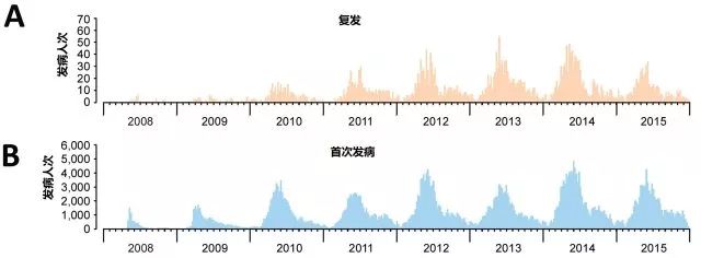 來自29個省份的數(shù)據(jù)表明,2008-2015年間共計12,256,102人次手足口病例上報至國家疾病預(yù)防和控制中心。如圖1所示,復(fù)發(fā)性手足口病一年中有兩個高峰,分別是春末夏初(4-6月) 和秋季(9-10月)。