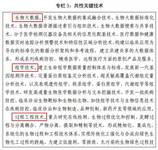 具體涉及的技術(shù)包括:1)新一代生物檢測(cè)技術(shù)、2)新一代基因操作技術(shù)、3)合成生物技術(shù)、4)腦科學(xué)和類腦人工智能、5)微生物組技術(shù)、6)納米生物技術(shù)、7)生物影像技術(shù)、8)生物大數(shù)據(jù)、9)組學(xué)技術(shù)以及10)過程工程技術(shù)(下圖為詳細(xì)介紹)。