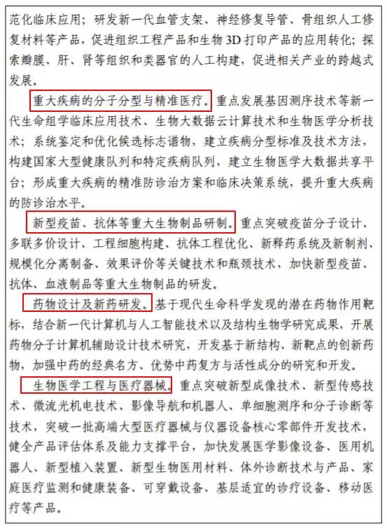 《規(guī)劃》提出,要突出創(chuàng)新藥物、醫(yī)療器械等重大產(chǎn)品研制和精準(zhǔn)化、個(gè)體化、可替代或可再 生為代表的未來醫(yī)學(xué)發(fā)展,重點(diǎn)突破新型疫苗、抗體制備、免疫治療等關(guān)鍵技術(shù),搶占生物醫(yī)藥產(chǎn)業(yè)戰(zhàn)略制高點(diǎn),力爭(zhēng)到 2020 年實(shí)現(xiàn)我國生物醫(yī)藥整體由“跟跑”到“并跑”、部分領(lǐng)域“領(lǐng)跑” 的轉(zhuǎn)變(下圖為詳細(xì)介紹)。